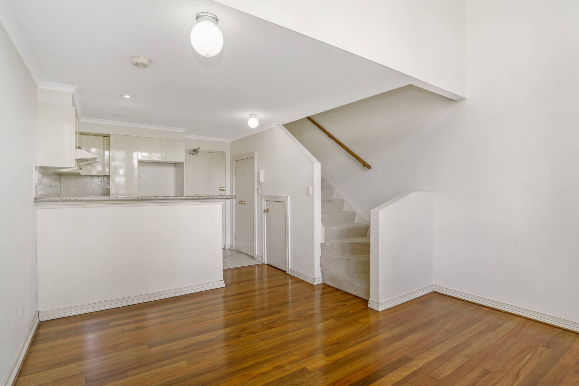 New York style split level one bedroom apartment with new carpet located in "Meridian", 5.5 metre ceilings, timber floors, modern kitchen and bathroom, one security car space.